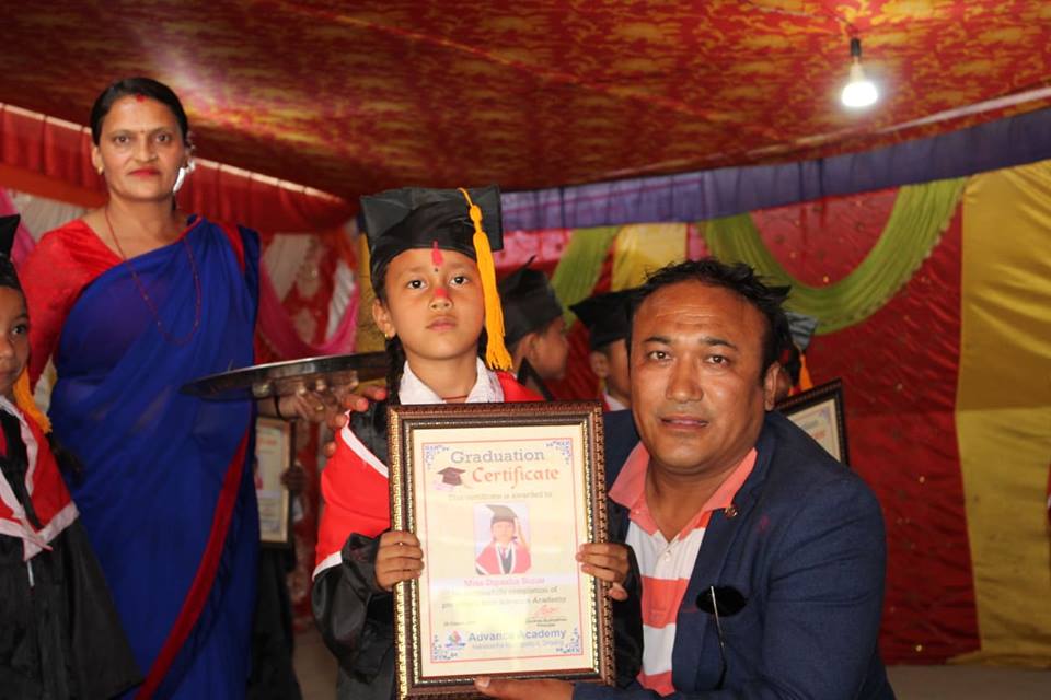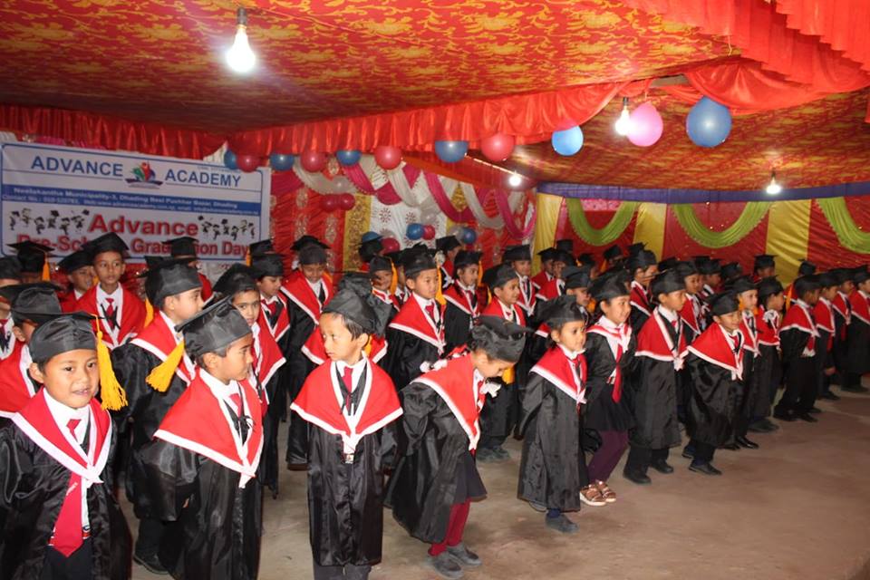 विद्यालयले बुधबार एक कार्यक्रमको आयोजना गरी विद्यार्थीहरुलाई दिक्षित गरेको छ । जिल्लामा पहिलो पटक एड्भान्स एकेडेमीले युकेजीबाट कक्षा १ मा जाने विद्यार्थीहरुलाई हौसाला सहित दिक्षित गर्दै आईरहेको छ ।अन्तराष्ट्रिय जगतमा हुने यस्तो प्रचनलन एड्भान्स एकेडेमीले गत बर्षदेखी सन्चालन गर्दै आईरहेको छ ।