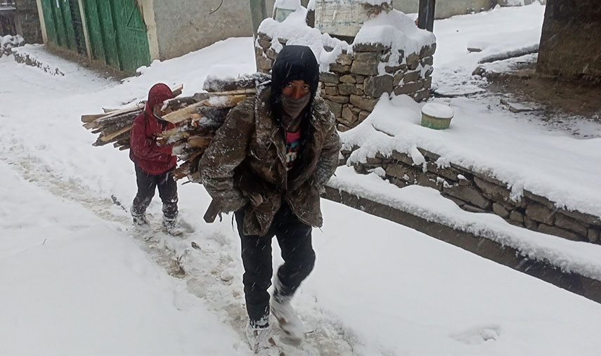 हुम्लामा भारी हिमपात हुँदा पनि साढे एक घण्टाको बाटो डाँडाफाया गाउँबाट हिँडेर सदरमुकाम सिमकोटमा दाउरा बिक्री गर्न पुगेका बालक ।
